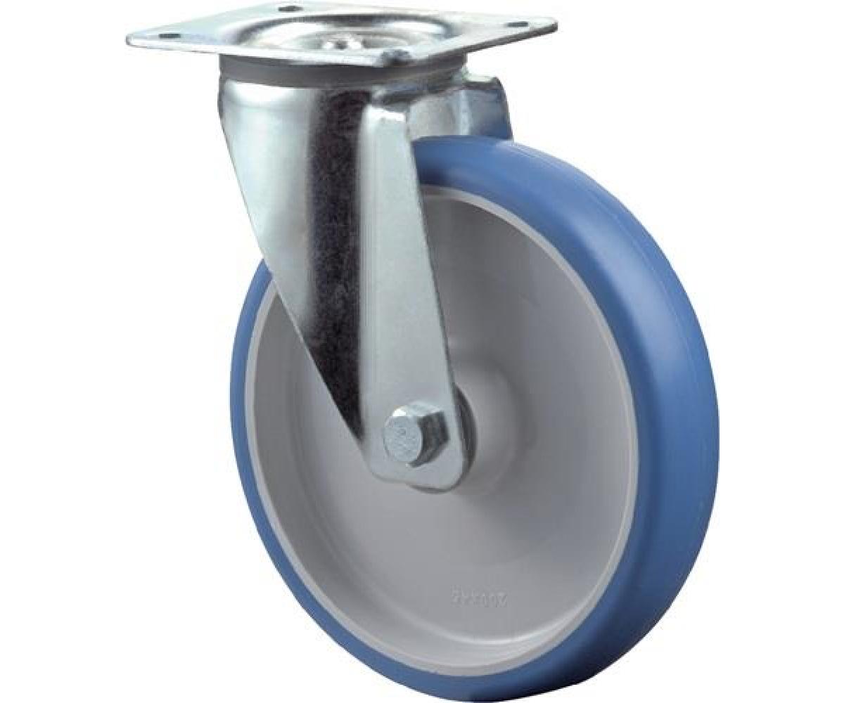 Transportgeräterolle · Gehäuse aus Stahlblech, verzinkt chromatiert · zweireihiger Kugelkranz im Gabelkopf · Rad: Lauffläche Polyurethan blau 85 +/- 4 Shore A, Radkörper aus Kunststoff · Rollenlager · Radachse verschraubt · mit Plattenbefestigung