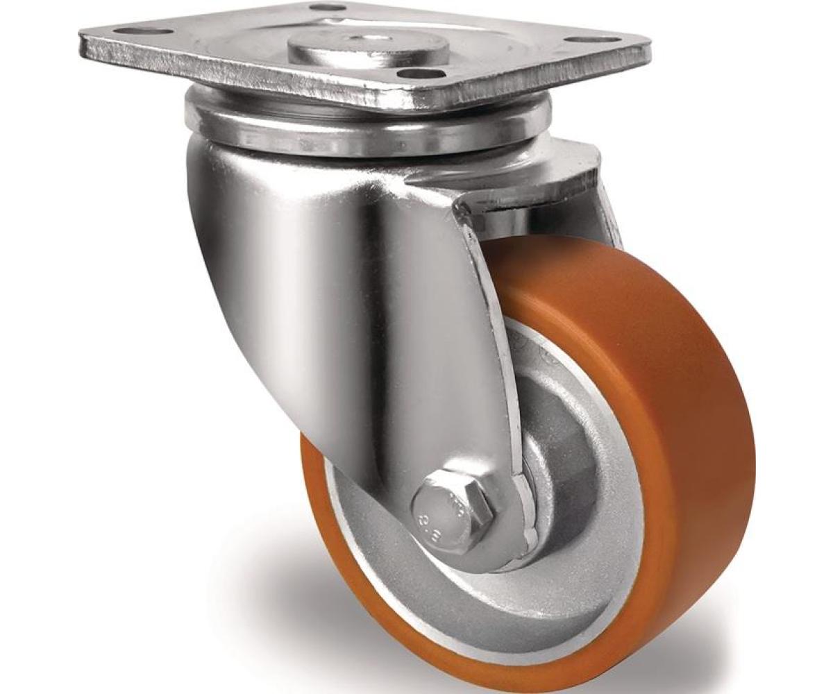 Transportrolle · Gabel aus Stahlblech · verzinkt-chromatiert · zweireihiger Kugelkranz im Gabelkopf · Kugellager · Lauffläche: Besothane Guss-Polyurethan 95 Shore · Alufelge · sehr hoher Rollwiderstand · mit Plattenbefestigung · hohe Spurtreue · stabiler Transport von höheren Lasten