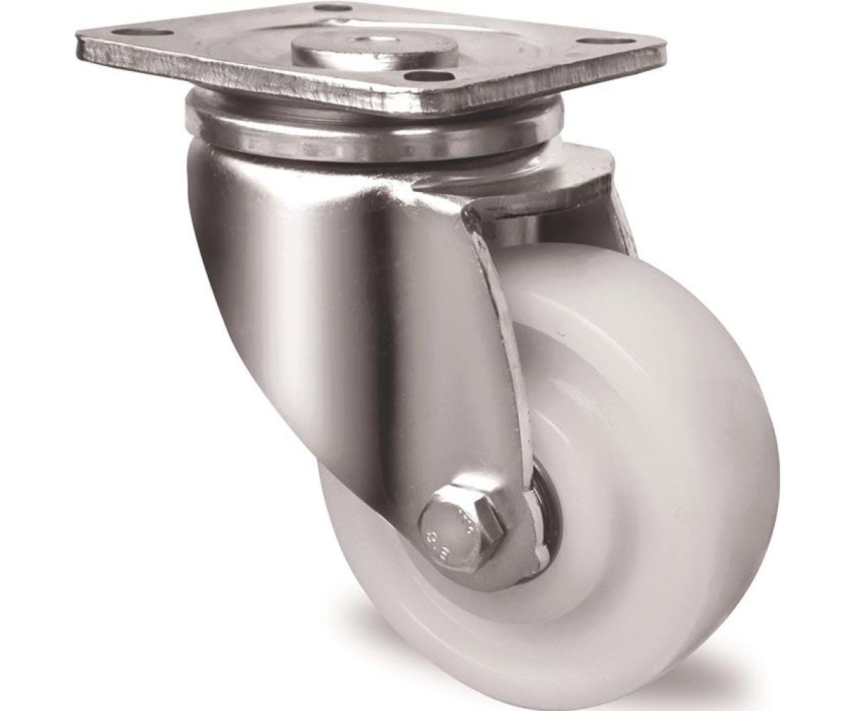 galvanisch blau verzinktes Stahlblechgehäuse · Gehäuse mit Materialstärke 6 mm (Befestigung) und 5 mm (Gabel) · Radkörper aus Polyamid · Lauffläche Polyamid PA6 weiß · Doppelkugellager · verschraubte Radachse · mit Plattenbefestigung