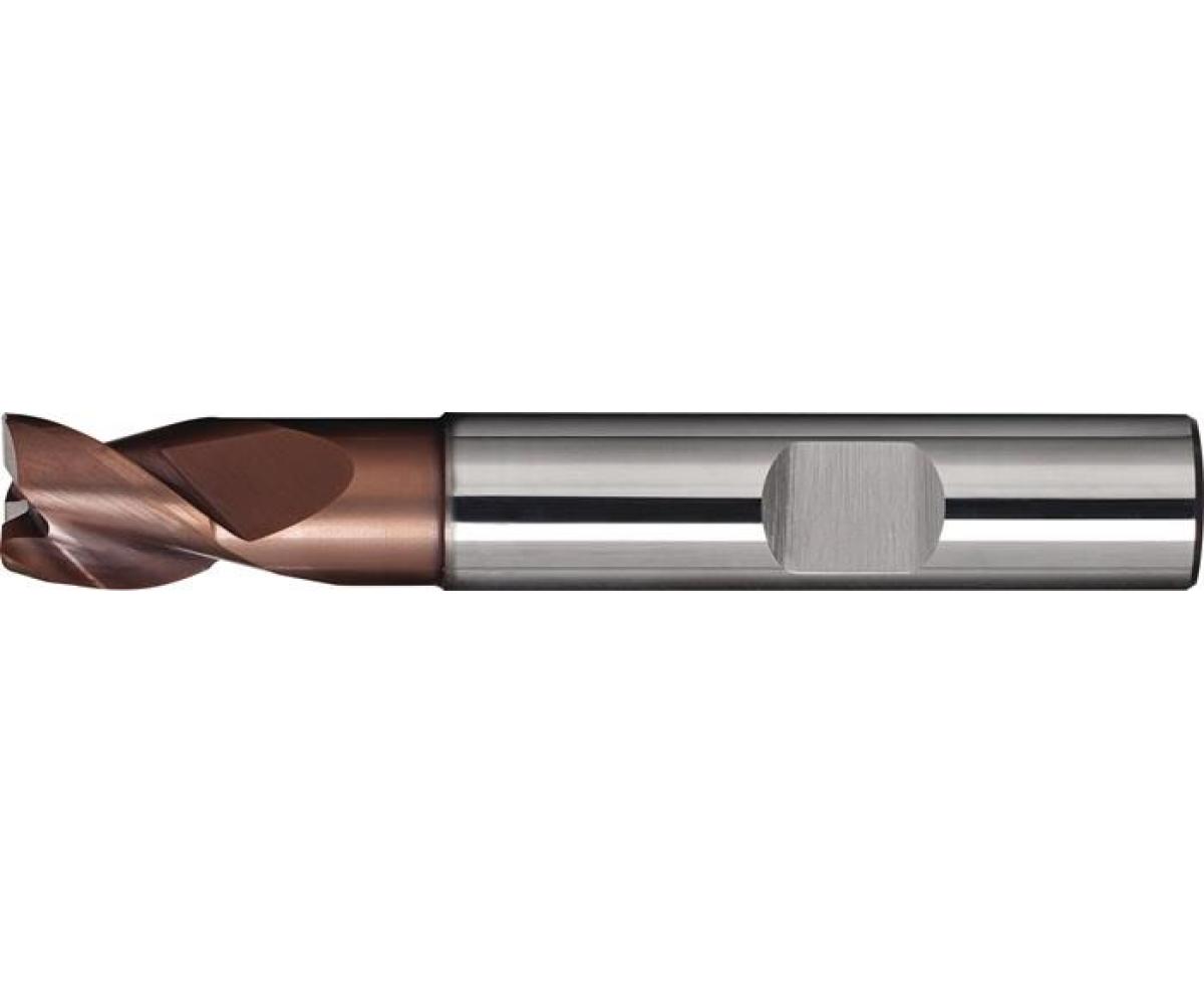 VHM · Universal-Feinstkorn · TiAlN-beschichtet · DIN 6527 K · Typ N · Dreischneider · kurz · 45° Schutzfase · Zentrumschnitt · mit Zylinderschaft nach DIN 6535 HB · ungleiche Steigung · rechtsschneidend · Halsfreischliff · für vibrationsarme Bearbeitung, zum Schruppen und Schlichten geeignet · durch neu entwickelte Geometrie und Beschichtung universell einsetzbar zum Fräsen in Stahl, Stahlguss, Grauguss, Temperguss, Cr-Ni-Stählen, NE-Metallen, Aluminium mit Siliciumanteil und abrasiven Werkstoffen