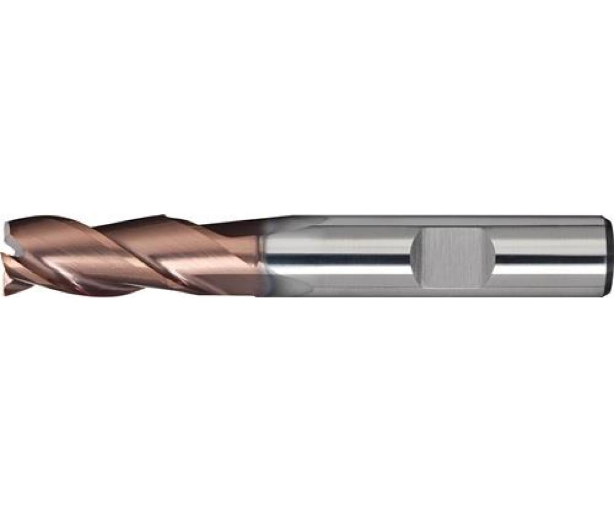 VHM · Universal-Feinstkorn · TiAlN-beschichtet · DIN 6527 L · Typ N · Dreischneider · lang · 45° Schutzfase · Zentrumschnitt · mit Zylinderschaft nach DIN 6535 HB · ungleiche Steigung · rechtsschneidend · Halsfreischliff · für vibrationsarme Bearbeitung, zum Schruppen und Schlichten geeignet · durch neu entwickelte Geometrie und Beschichtung universell einsetzbar zum Fräsen in Stahl, Stahlguss, Grauguss, Temperguss, Cr-Ni-Stählen, NE-Metallen, Aluminium mit Siliciumanteil und abrasiven Werkstoffen