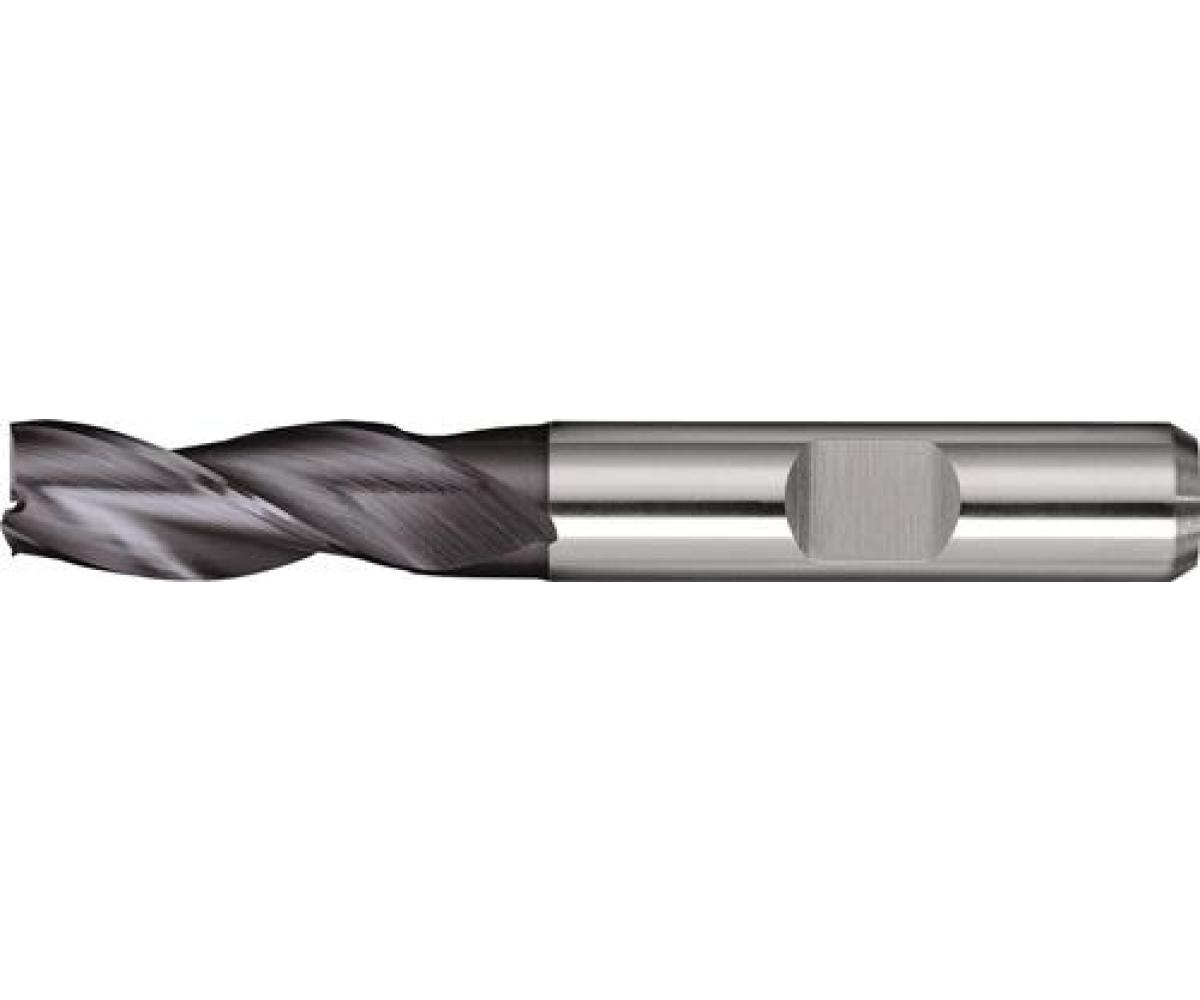 HSS-Co8 · DIN 844 · Typ N · Dreischneider · lang · Zentrumschnitt · Zylinderschaft mit Mitnahmefläche · rechtsschneidend · zum Fräsen von Werkstoffen mit geringer und mittlerer Festigkeit bis ca. 800 N/mm² mit unbeschichtetem Werkzeug und 1000 N/mm² mit beschichtetem Werkzeug · Nenn-Ø 9, 11, 13, 15 mm = Toleranz h10, Rest = e8