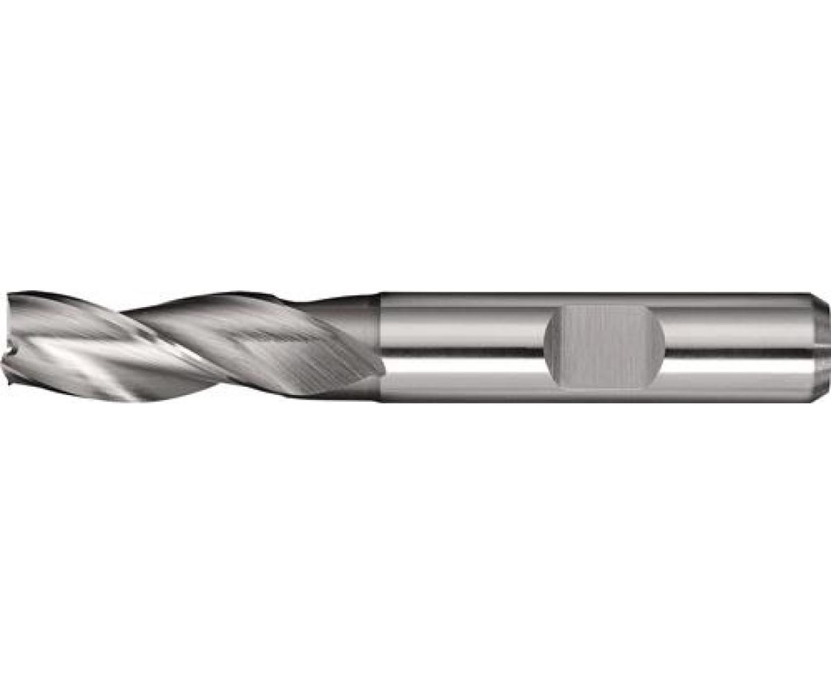 HSS-Co8 · DIN 844 · Typ N · Dreischneider · lang · Zentrumschnitt · Zylinderschaft mit Mitnahmefläche · rechtsschneidend · zum Fräsen von Werkstoffen mit geringer und mittlerer Festigkeit bis ca. 800 N/mm² mit unbeschichtetem Werkzeug und 1000 N/mm² mit beschichtetem Werkzeug · Nenn-Ø 9, 11, 13, 15 mm = Toleranz h10, Rest = e8