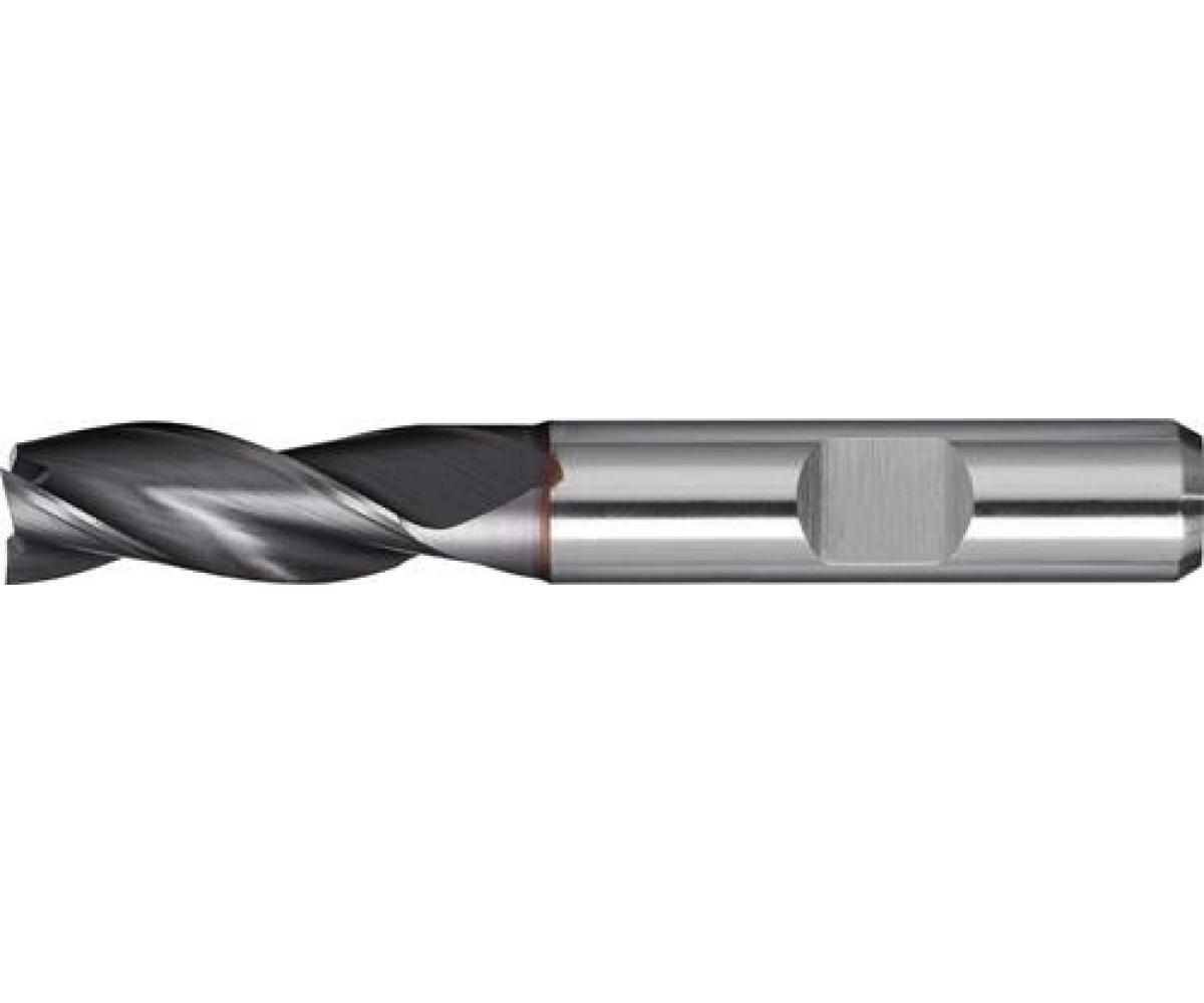 HSS-Co8 · DIN 844 · Typ N · Dreischneider · lang · Zentrumschnitt · Zylinderschaft mit Mitnahmefläche · rechtsschneidend · zum Fräsen von Werkstoffen mit geringer und mittlerer Festigkeit bis ca. 800 N/mm² mit unbeschichtetem Werkzeug und 1000 N/mm² mit beschichtetem Werkzeug · Nenn-Ø 9, 11, 13, 15 mm = Toleranz h10, Rest = e8