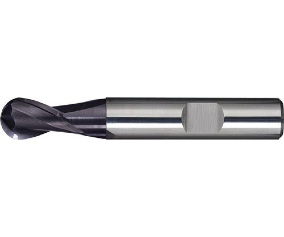 VHM · Universal-Feinstkorn · TiAlN-beschichtet · Werksnorm · Typ N · Zweischneider · kurz · Zentrumschnitt · mit Zylinderschaft nach DIN 6535 HB · 30 ° Drallwinkel · rechtsschneidend · zum Fräsen von Stahl und Stahlguss, Grauguss, Temperguss, CrNi-Stählen, Bronze, Messing, Kupfer, Aluminium mit Siliciumanteil und abrasiven Kunststoffen