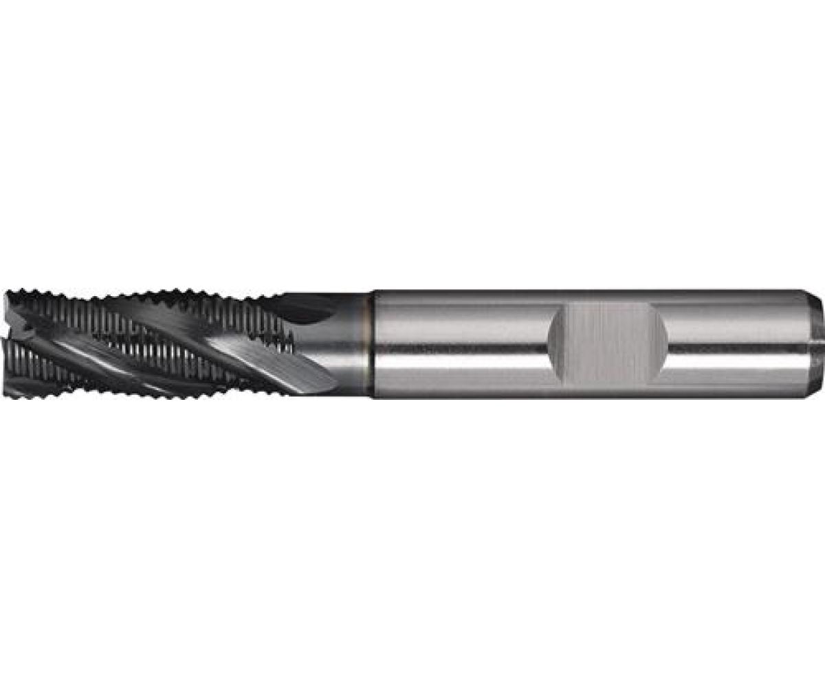 HSS-Co PM · ALCRONA-beschichtet · DIN 844 · Typ HR · Vierschneider · kurz · 45° Schutzfase · Zentrumschnitt · Zylinderschaft mit Mitnahmefläche · rechtsschneidend · zum Fräsen von Werkstoffen bis ca. 1400 N/mm² Festigkeit · verbesserte Werkzeugsteifigkeit durch konischen Spannutengrund