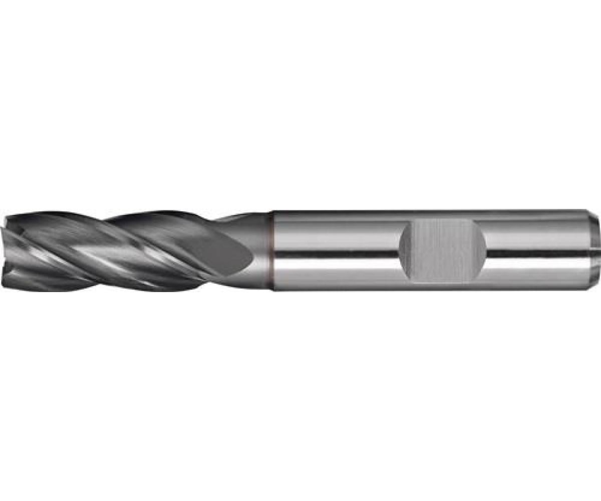 HSS-Co8 · DIN 844 · Typ N · Vierschneider · kurz · Zentrumschnitt · Zylinderschaft mit Mitnahmefläche · rechtsschneidend · zum Fräsen von Werkstoffen mit geringer und mittlerer Festigkeit bis ca. 800 N/mm² mit unbeschichtetem Werkzeug und 1000 N/mm² mit beschichtetem Werkzeug
