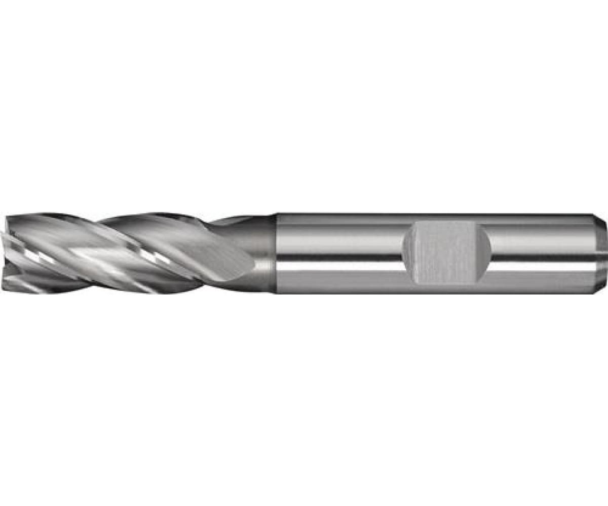 HSS-Co8 · DIN 844 · Typ N · Vierschneider · kurz · Zentrumschnitt · Zylinderschaft mit Mitnahmefläche · rechtsschneidend · zum Fräsen von Werkstoffen mit geringer und mittlerer Festigkeit bis ca. 800 N/mm² mit unbeschichtetem Werkzeug und 1000 N/mm² mit beschichtetem Werkzeug