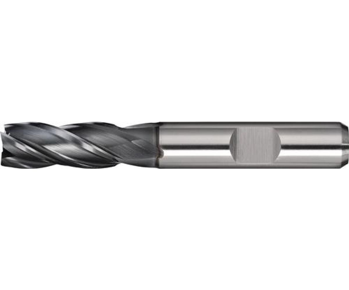 HSS-Co PM · ALCRONA-beschichtet · DIN 844 · Typ N · Vierschneider · kurz · Zentrumschnitt · Zylinderschaft mit Mitnahmefläche · rechtsschneidend · zum Fräsen von Werkstoffen mit geringer und mittlerer Festigkeit bis ca. 1000 N/mm² · Vibrationsreduktion durch ungleich geteilte Schneiden · verbesserte Werkzeugsteifigkeit durch konischen Spannutengrund
