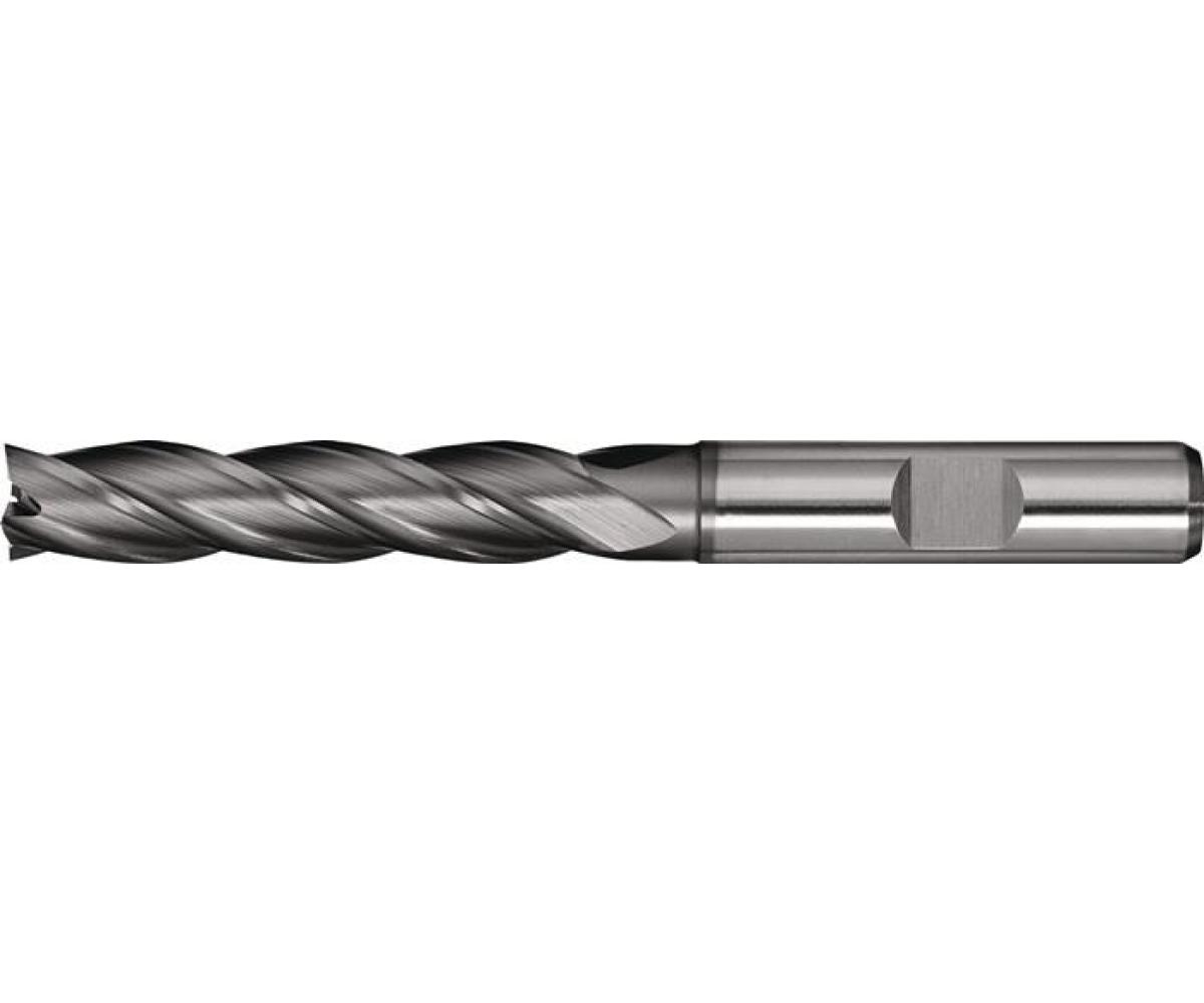 HSS-Co8 · DIN 844 · Typ N · Vierschneider · lang · Zentrumschnitt · Zylinderschaft mit Mitnahmefläche · rechtsschneidend · zum Fräsen von Werkstoffen mit geringer und mittlerer Festigkeit bis ca. 800 N/mm² mit unbeschichtetem Werkzeug und 1200 N/mm² mit beschichtetem Werkzeug