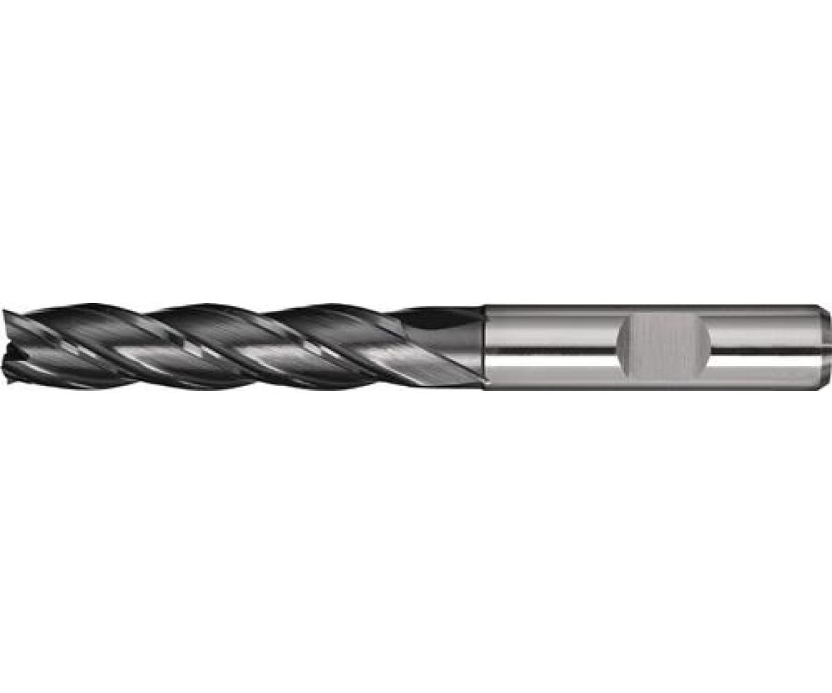 HSS-Co PM · ALCRONA-beschichtet · DIN 844 · Typ N · Vierschneider · lang · Zentrumschnitt · Zylinderschaft mit Mitnahmefläche · rechtsschneidend · zum Fräsen von Werkstoffen mit geringer und mittlerer Festigkeit bis ca. 1000 N/mm² · Vibrationsreduktion durch ungleich geteilte Schneiden · verbesserte Werkzeugsteifigkeit durch konischen Spannutengrund