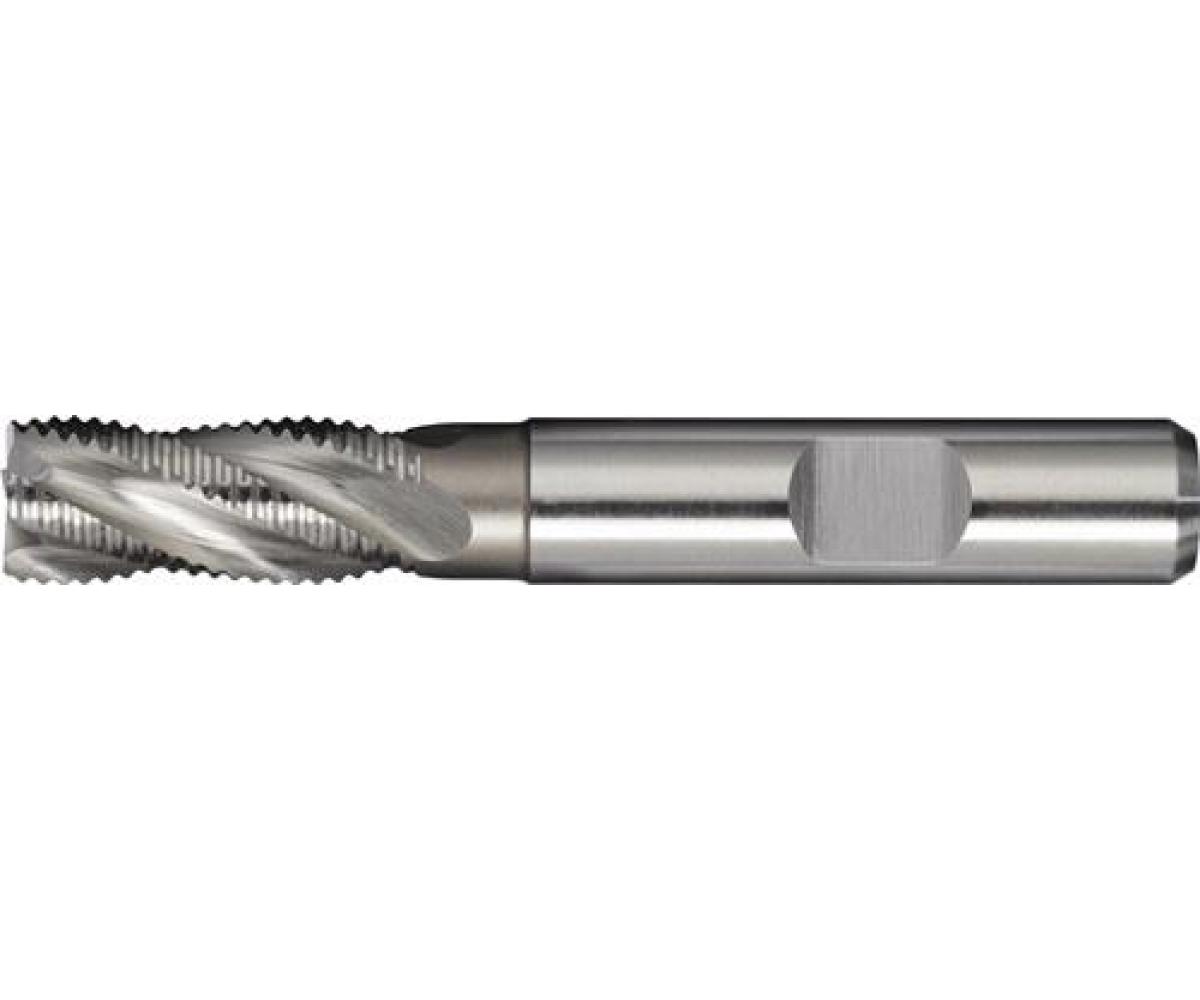 HSS-Co5 · DIN 844 · Typ HR · Vierschneider · kurz · 45° Schutzfase · Zentrumschnitt · hinterschliffenes feines Kordelprofil · Zylinderschaft mit Mitnahmefläche · rechtsschneidend · zum Fräsen von Werkstoffen mit Festigkeit bis ca. 800 N/mm² mit unbeschichtetem Werkzeug und 1200 N/mm² mit beschichtetem Werkzeug