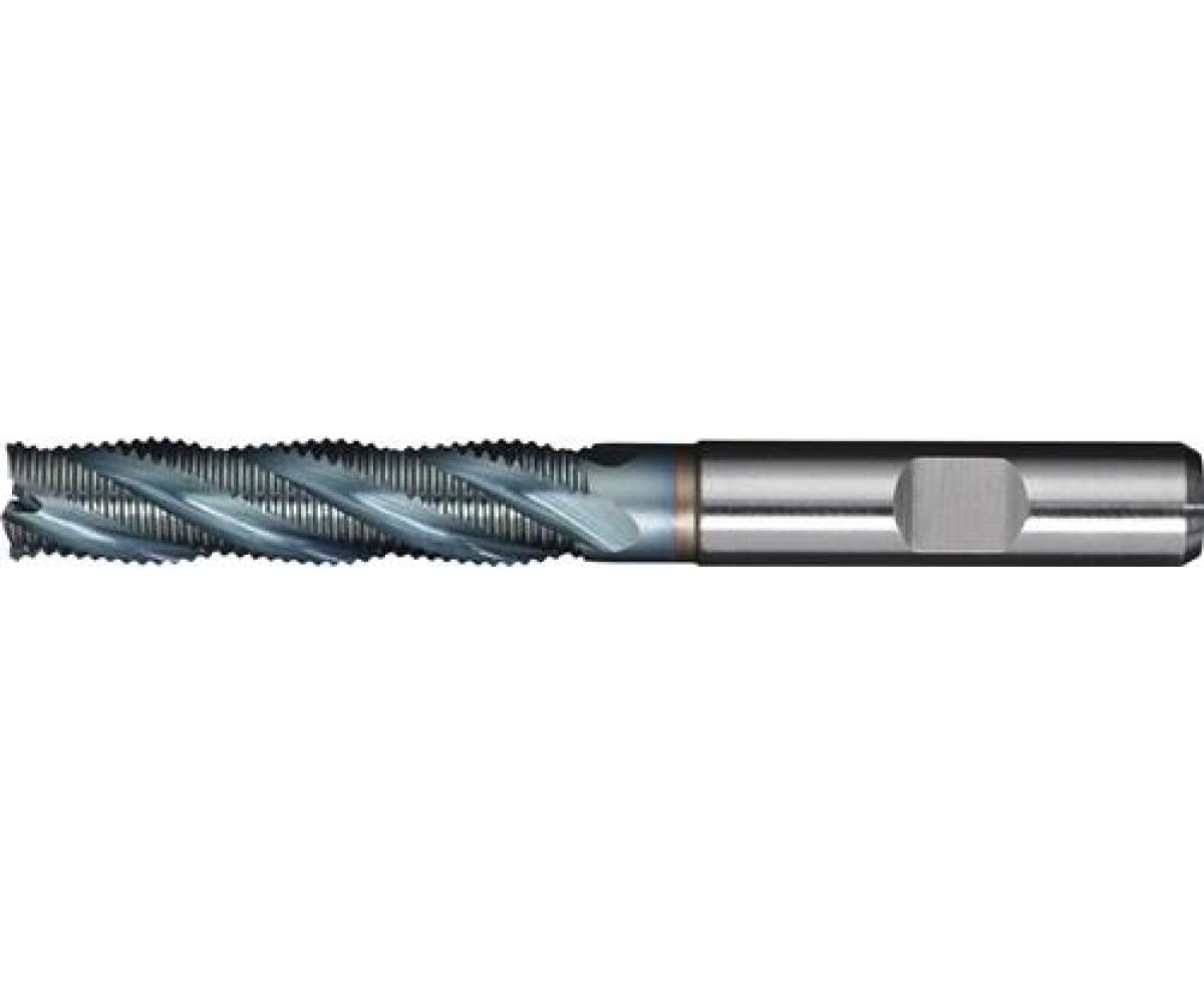 HSS-Co5 · TiCN-beschichtet · DIN 844 · Typ HR · Vierschneider · lang · 45° Schutzfase · Zentrumschnitt · hinterschliffenes feines Kordelprofil · Zylinderschaft mit Mitnahmefläche · rechtsschneidend · zum Fräsen von Werkstoffen mit Festigkeit bis ca. 1200 N/mm²