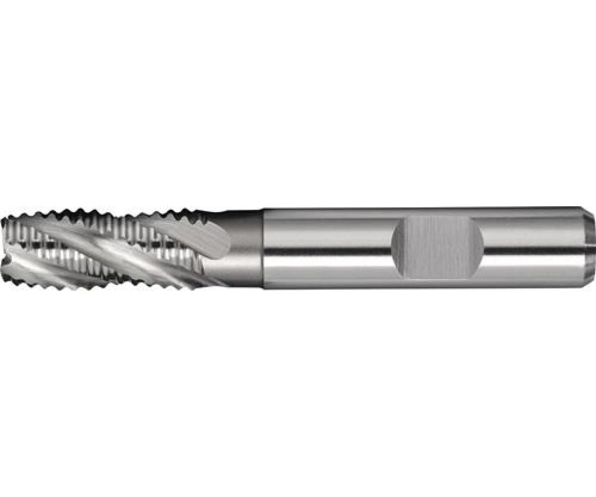 HSS-Co5 · DIN 844 · Typ NR · Mehrschneider · kurz · 45° Schutzfase · Zentrumschnitt · hinterschliffenes Kordelprofil · Zylinderschaft mit Mitnahmefläche · rechtsschneidend · zum Fräsen von Werkstoffen mit geringer und mittlerer Festigkeit bis ca. 800 N/mm² mit unbeschichtetem Werkzeug und 1000 N/mm² mit beschichtetem Werkzeug