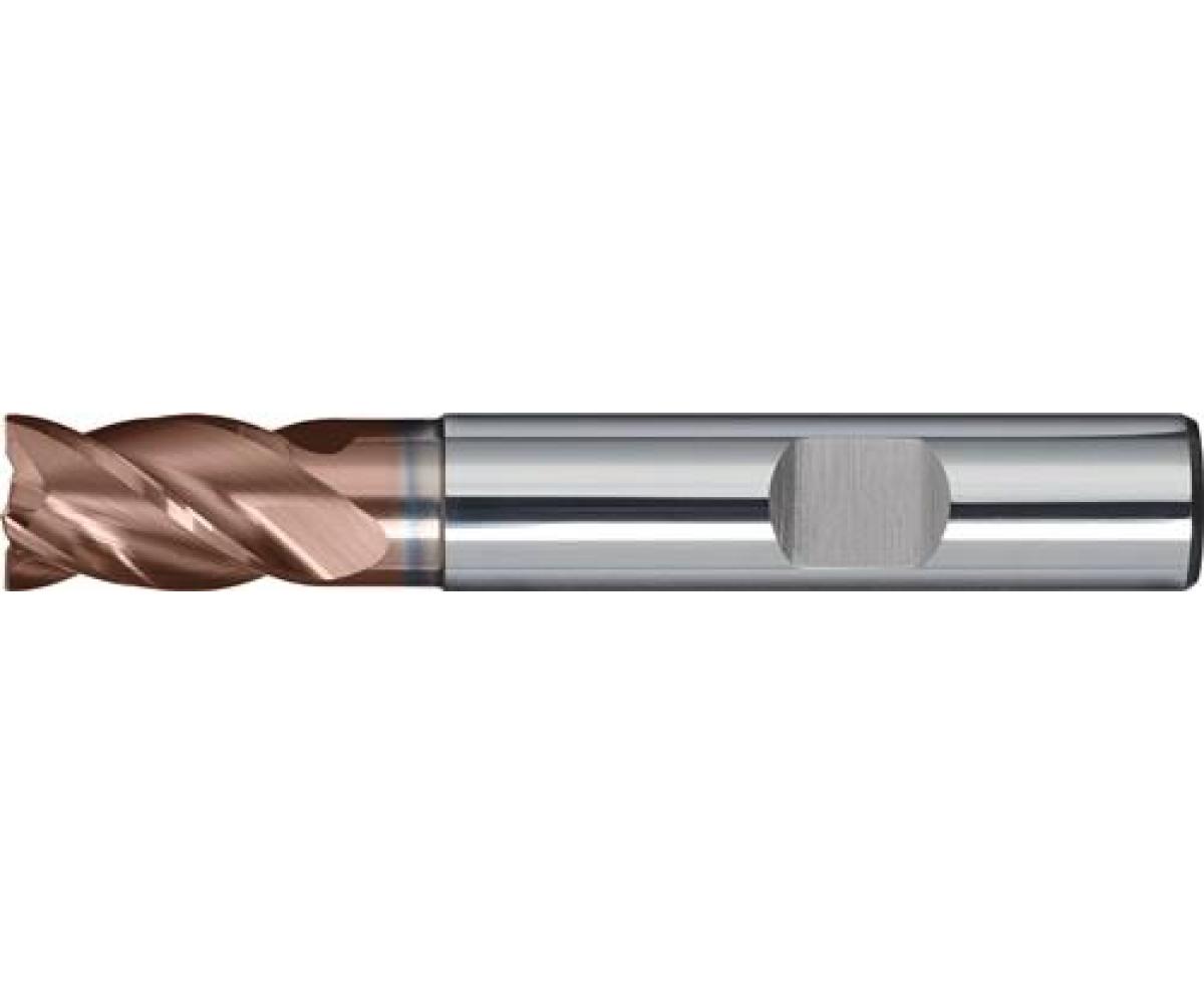VHM · Universal-Feinstkorn · TiAlN-beschichtet · DIN 6527 K · Typ N/HPC · Vierschneider · kurz · 45° Schutzfase · Zentrumschnitt · mit Zylinderschaft nach DIN 6535 HB · ungleiche Steigung · rechtsschneidend · Halsfreischliff · für vibrationsarme Bearbeitung, zum Schruppen und Schlichten geeignet · durch neu entwickelte Geometrie und Beschichtung universell einsetzbar zum Fräsen in Stahl, Stahlguss, Grauguss, Temperguss, Cr-Ni-Stählen, NE-Metallen, Aluminium mit Siliciumanteil und abrasiven Werkstoffen