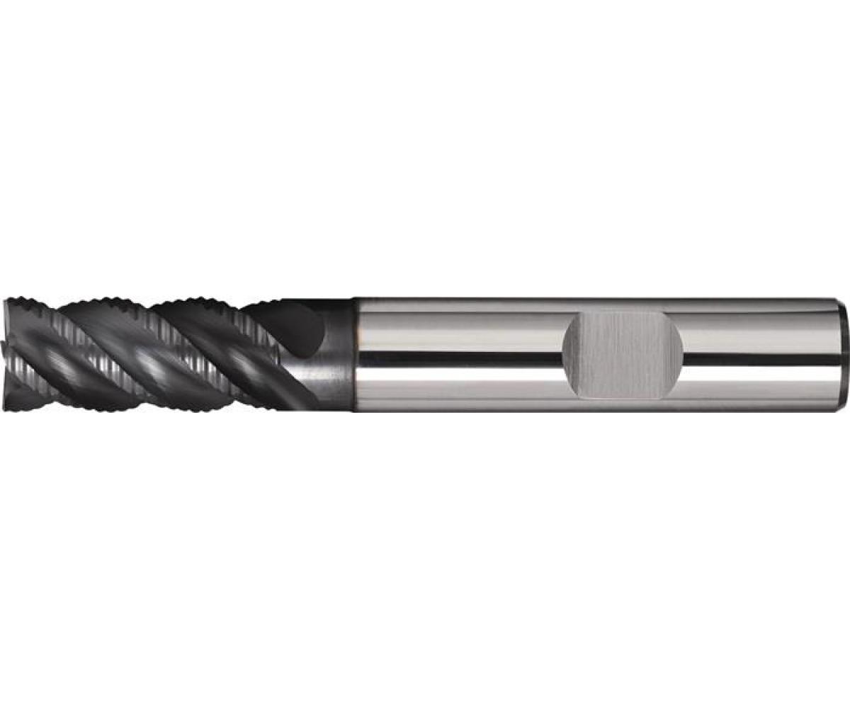 VHM · Universal-Feinstkorn · TiAlN-beschichtet · DIN 6527 L · Typ NR · Vierschneider · lang · 45 ° Schutzfase · mit Zylinderschaft nach DIN 6535 HB · 45 ° Drallwinkel · rechtsschneidend · Halsfreischliff · positiver Spanwinkel für höhere Einsatzflexibilität · Schneidenausführung mit speziellem Schruppprofil · ermöglicht eine schwingungsarme Bearbeitung
