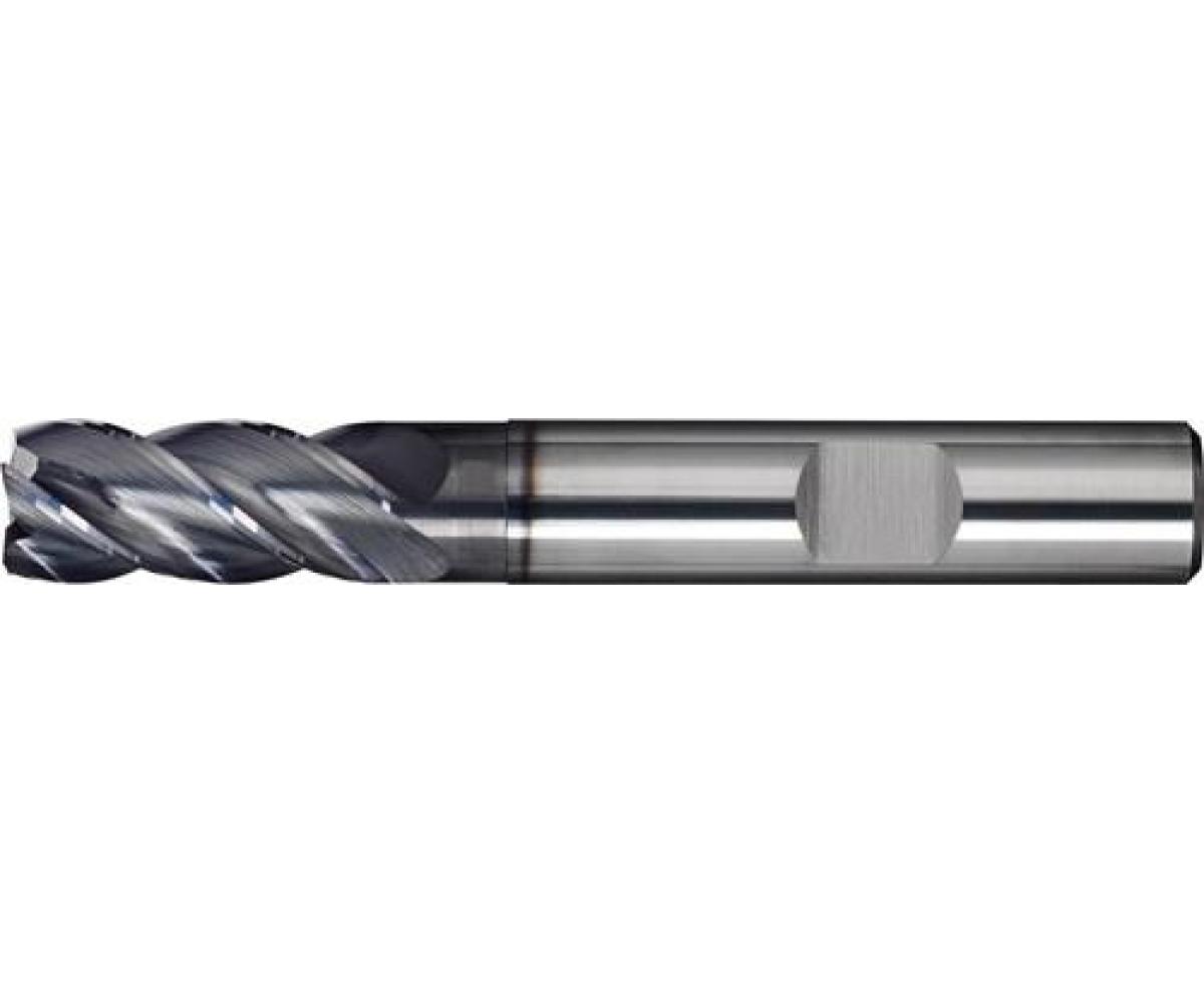 VHM · Universal-Feinstkorn · TiAlN-beschichtet · DIN 6527 L (ähnlich) · Typ INOX/HPC · Vierschneider · lang · 45° Schutzfase · Zentrumschnitt · mit Zylinderschaft nach DIN 6535 HB · ungleiche Steigung · ungleiche Teilung · rechtsschneidend · Halsfreischliff ab Nenn-Ø 6 mm