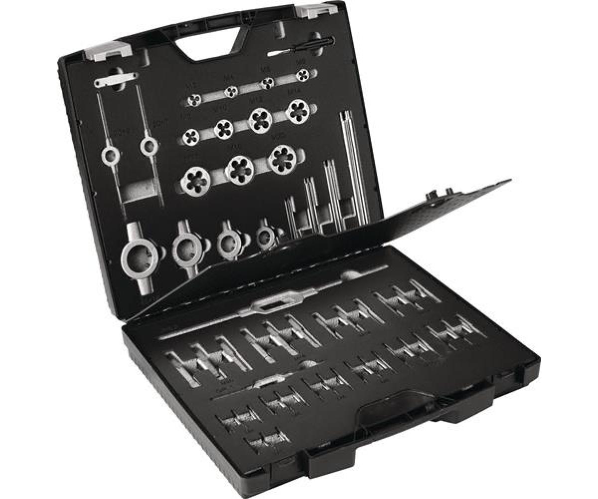 Weitere technische Eigenschaften · Schneidstoff: HSS · Inhalt: 54 teilig · Gewindeschneidzeugsatz · M3-M20 54tlg.HSS · Ku.-Kass.TECWERK · bestehend aus: je 1 Satz Handgewindebohrer 3tlg. DIN 352 M3, M4, M5, M6, M8, M10, M12, M14, M16, M18, M20 je 1 Stück Schneideisen EN 22568 M3, M4, M5, M6, M8, M10, M12, M14, M16, M18, M20 je 1 Stück Schneideisenhalter 20 x 5, 20 x 7, 25 x 9, 30 x 11, 38 x 14, 45 x 18 je 1 Stück verstellbares Windeisen Gr. 1 + 3 je 1 Stück Schraubendreher, Gewindelehre ·