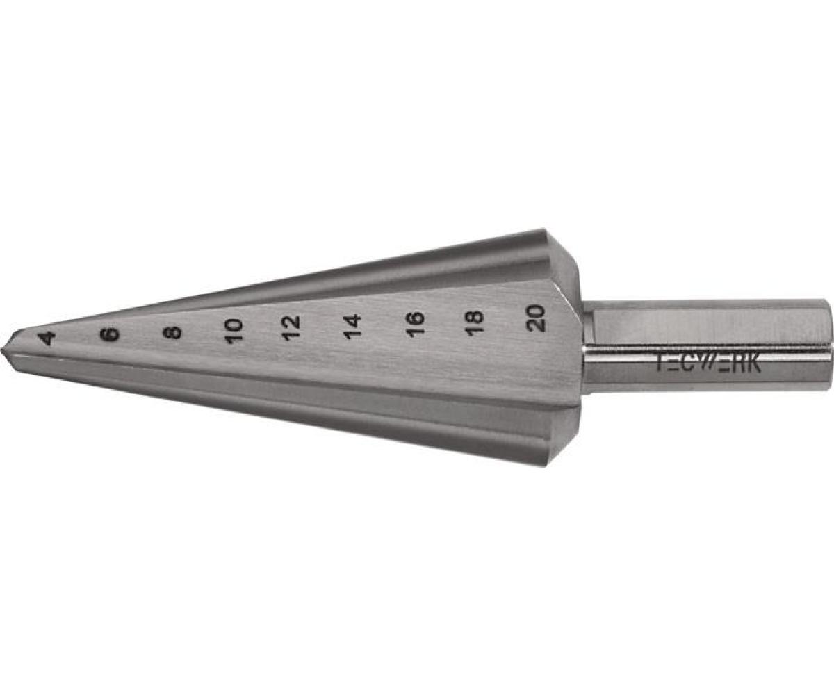 Schaft mit 3 Spannflächen · mit 2 Schneiden · Senkwinkel 20 ° · konisch ansteigende Schneiden radial hinterschliffen, dadurch wird ein schälender Schnitt erzielt · Universalwerkzeug mit breitem Anwendungsbereich, besonders für die Blechbearbeitung, aber auch für Kunststoffe geeignet · auf jeder Bohrmaschine verwendbar
