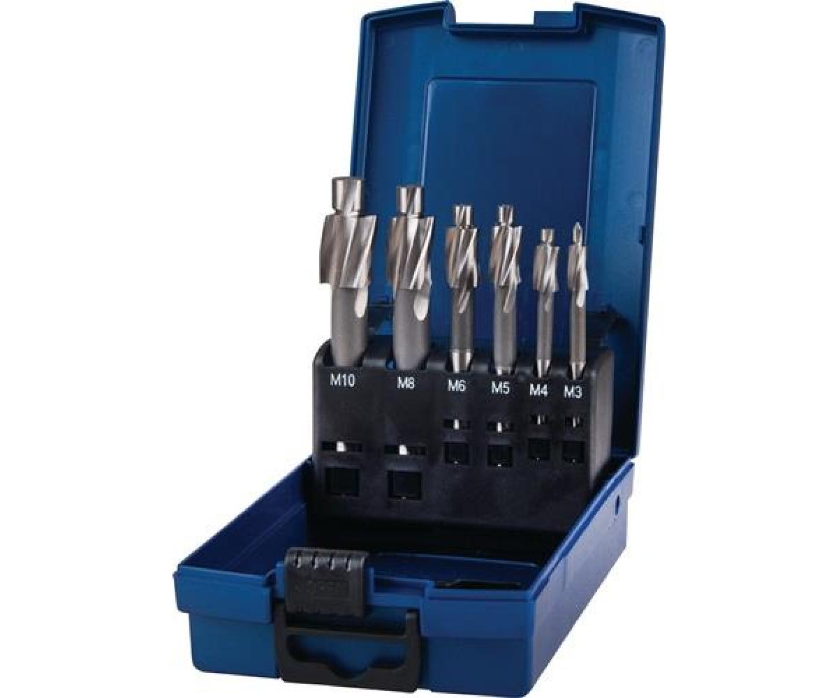 je 1 Flachsenker für Gewinde M3 / M4 / M5 / M6 / M8 und M10 in schlag- und bruchfester KunststoffkassetteTechnische Daten
