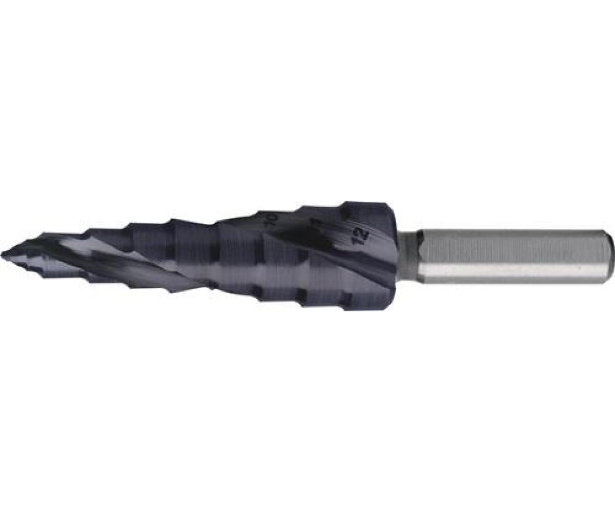 HSS · RUnaTEC-beschichtet · spiralgenutet · mit Kreuzanschliff · 2 Schneiden · mit FLOWSTEP®-Spitze · Spitzenwinkel 118 ° · Stufenwinkel 90 ° · 3-Flächenschaft · rechtsschneidend · punktgenaues Zentrieren ohne Ankörnen auch auf runden Oberflächen wie z. B. Rohren · extrem schnelles und kräfteschonendes Anbohren durch die FLOWSTEP® Spitze · leichter und ruhiger Bohrvorgang · 3-Flächenschaft verhindert das Durchdrehen im Bohrfutter · optimal geeignet für den Einsatz in handgeführten Elektro-Werkzeugen · FLOWSTEP® Technologie auf allen Stufen: Weicher und nahtloser Übergang zwischen den verschiedenen Durchmessern beim Bohrvorgang · bis zu 2-mal mehr Bohrungen durch Standzeitverlängerung · deutlich verbessertes Bohrergebnis · extrem hohe Verschleißfestigkeit und Warmhärte
