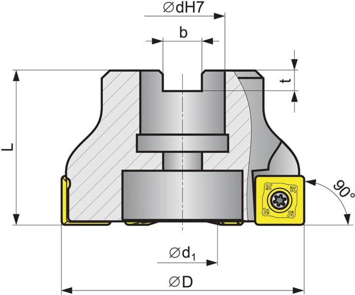 90° · vernickelte Ausführung · mit Innenkühlung · für die mittlere bis schwere Zerspanung · Eck- und Planfräsen mit Einsatztiefen bis zu 10 mm möglich · für Wendeschneidplatte SDMT 120508...