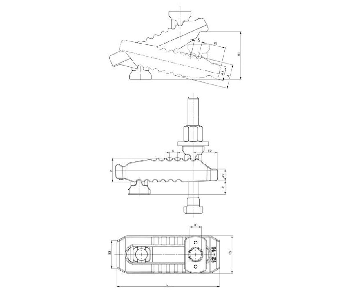 Weitere technische Eigenschaften · Länge: 187 mm · A: 42mm · B1: 21mm · B2: 62mm · E2: 44mm · E1: 44mm · Gewicht: 3018g · A2: 20mm · H1: 0-80mm · H2: 30mm · L: 187mm · A1: 27mm · K: 14mm · B3: 30mm · Spannpratze Nr.6312VT · Krokodil f.T-Nut 20mm · Spann-H.0-80mm ·